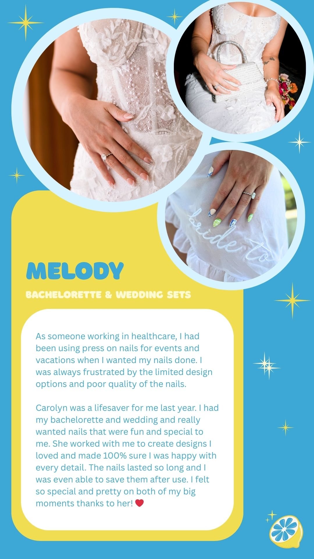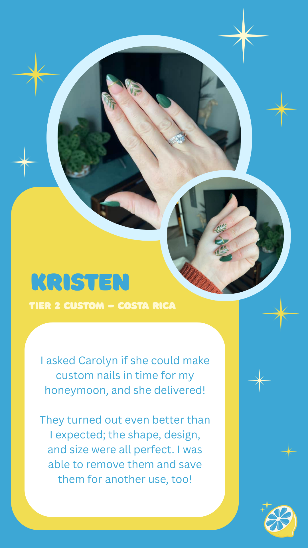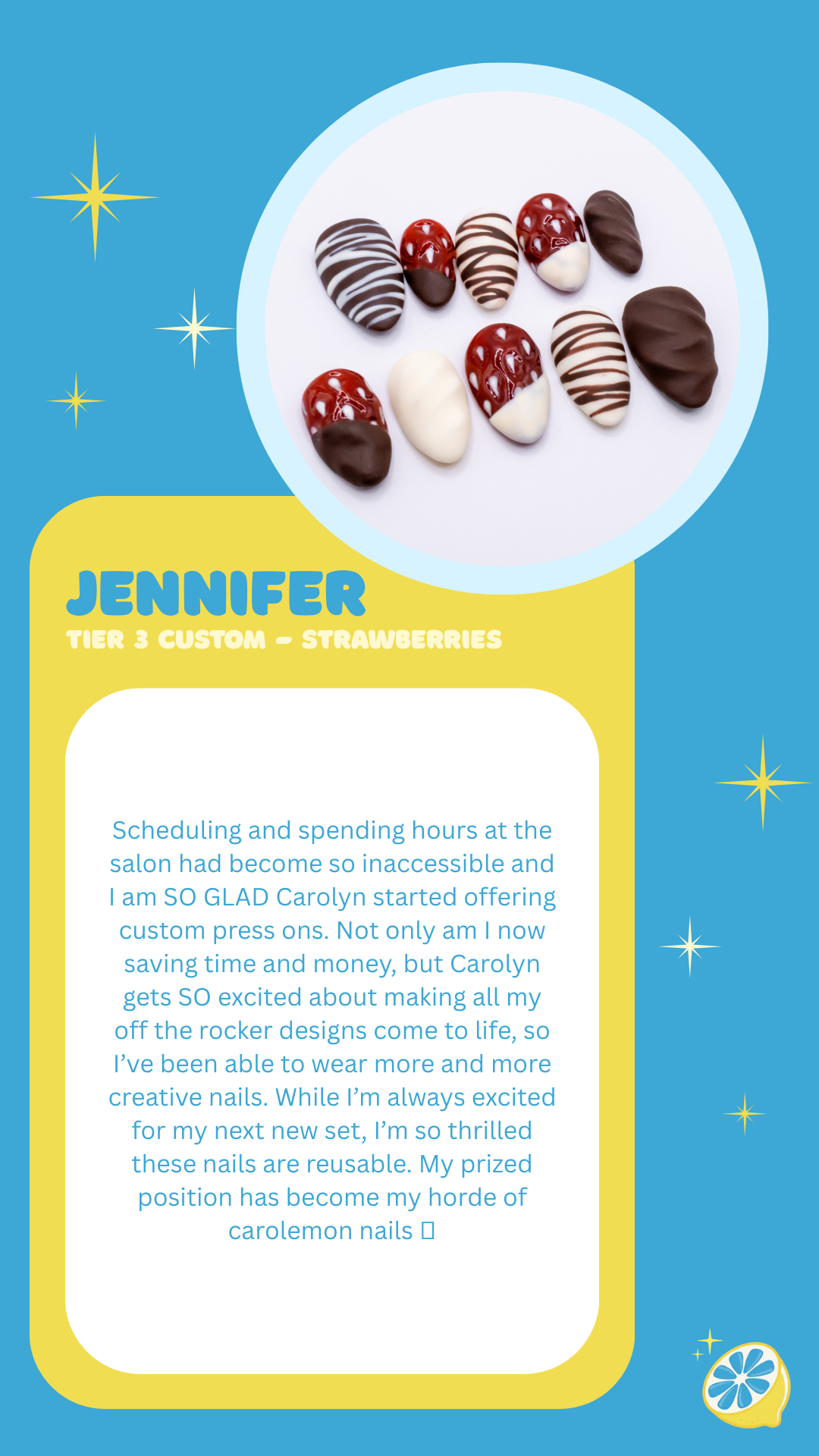 Please allow 10-14 days for your Tier 3 Carolemon Custom Nails to be created and shipped. 📮 If a Rush Order is needed, please include the “Get My Nails Fast” product for delivery within 4 business days. ⚡