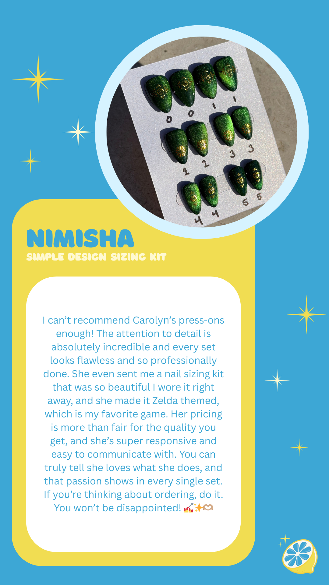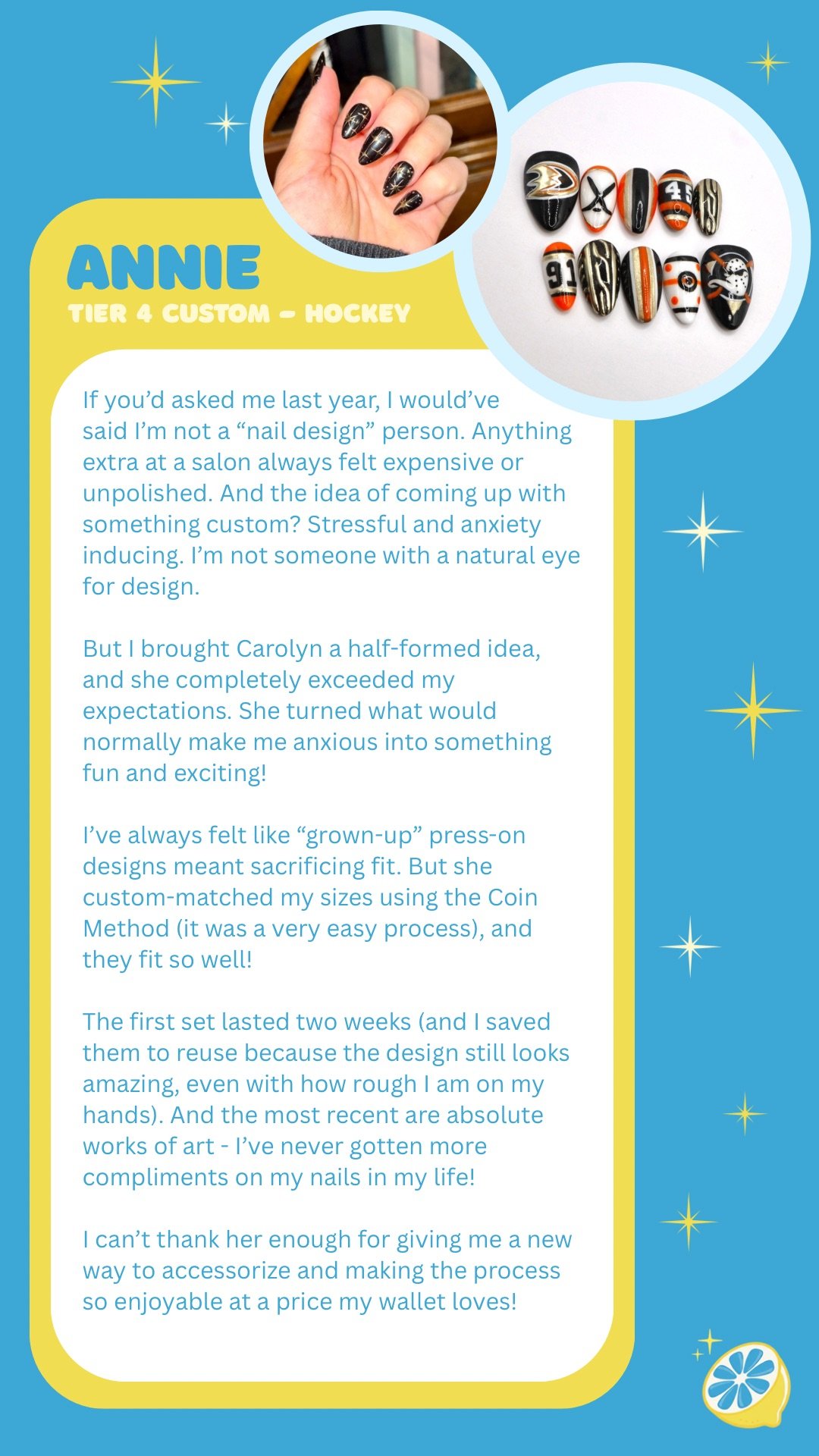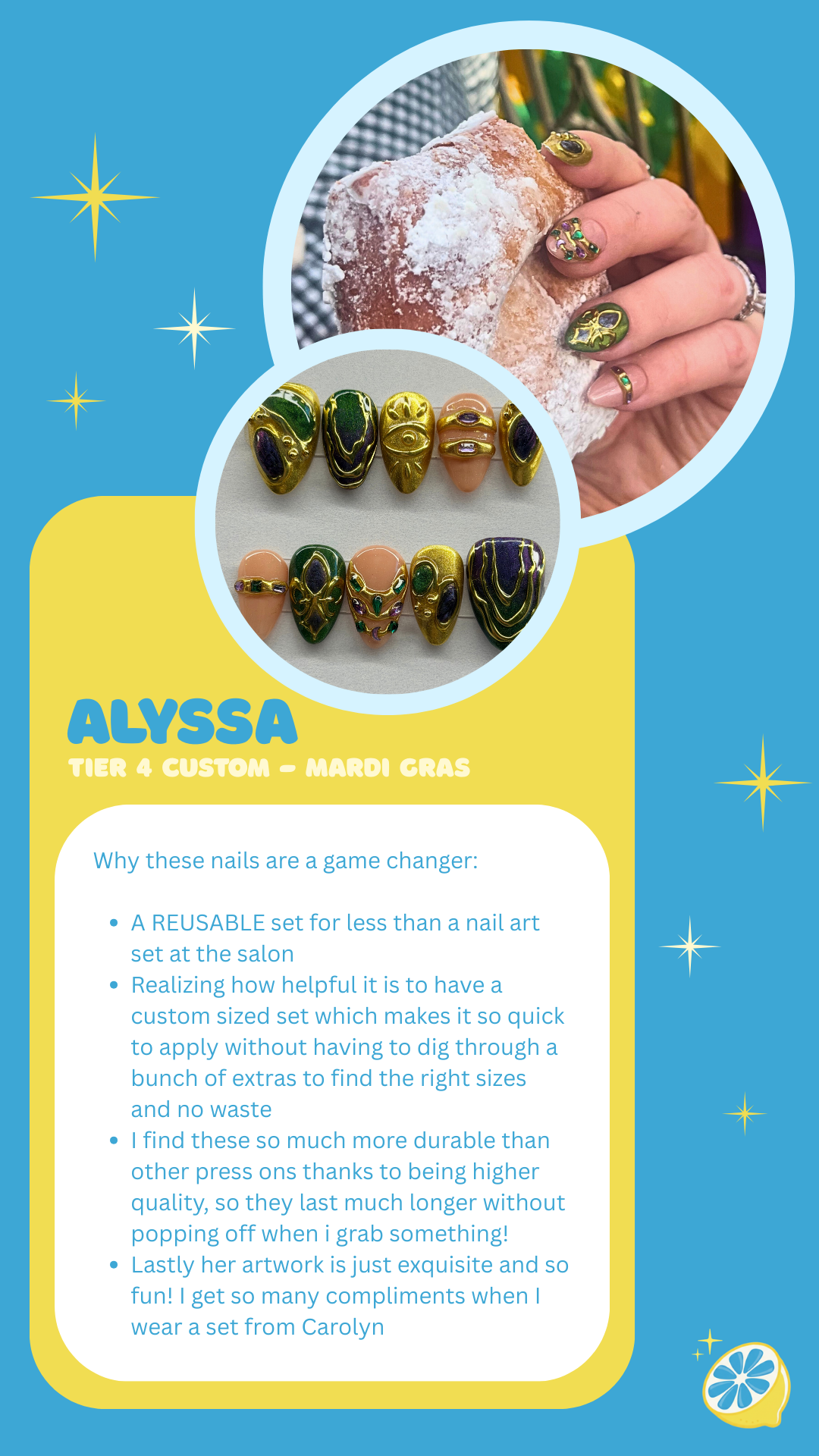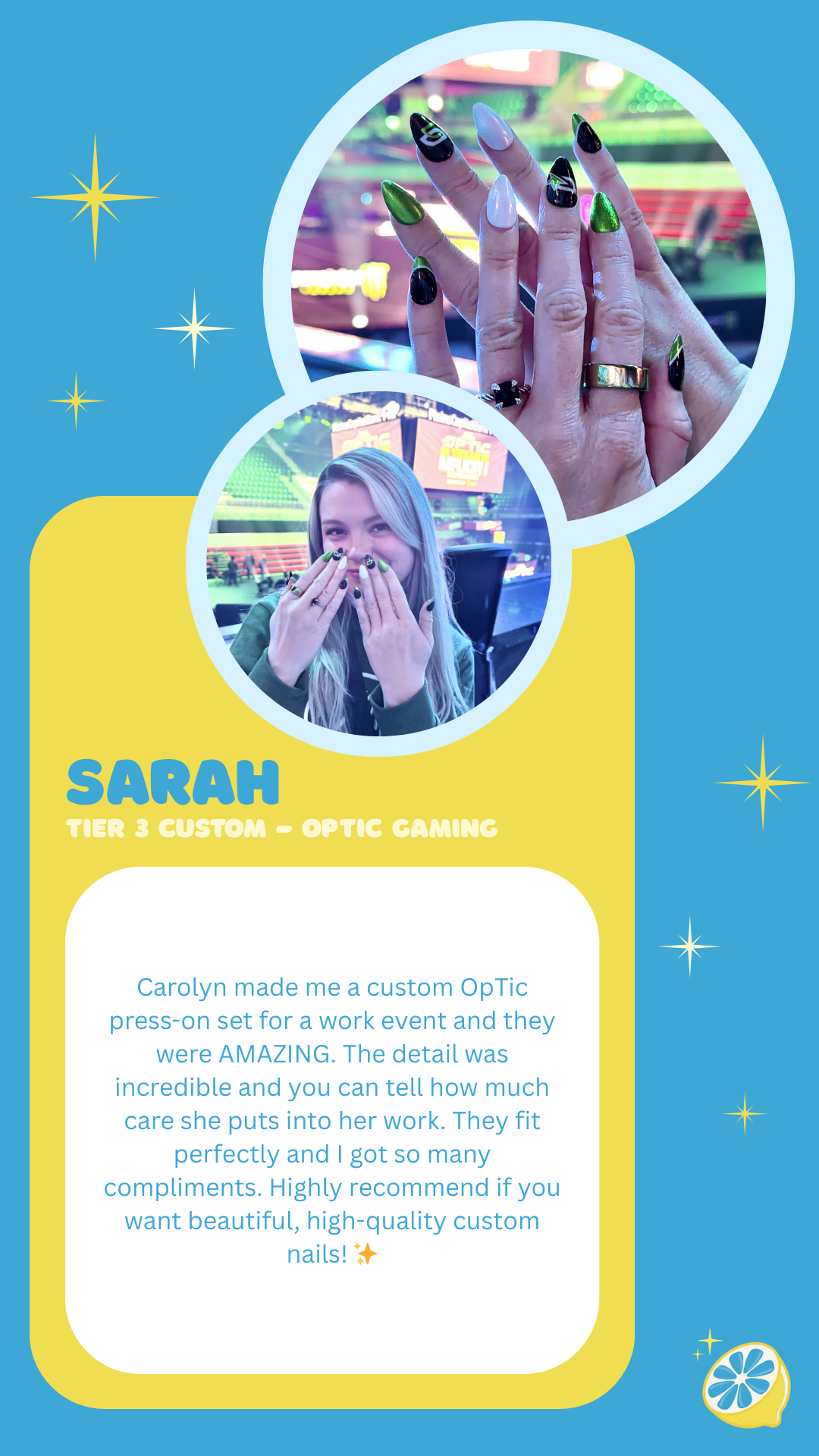 Please allow 10-14 days for your Tier 3 Carolemon Custom Nails to be created and shipped. 📮 If a Rush Order is needed, please include the “Get My Nails Fast” product for delivery within 4 business days. ⚡
